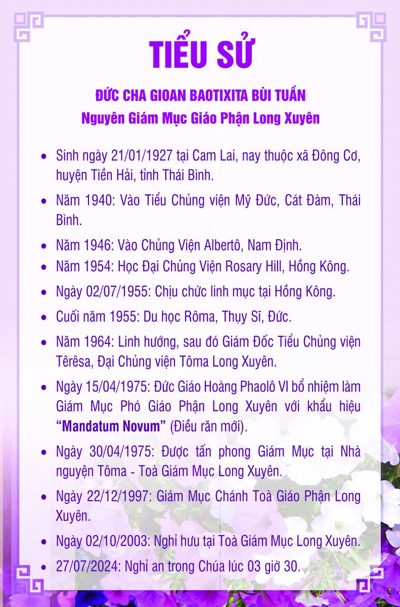 Trong niềm tin vào Chúa Kitô Phục Sinh, Giáo phận Long Xuyên và gia đình trân trọng kính báo Đức cha Gioan Baotixita Bùi Tuần, nguyên Giám mục Giáo phận Long Xuyên, sinh ngày 21.01.1927 đã an nghỉ trong Chúa lúc 03 giờ 30 phút thứ Bảy, ngày 27.07.2024.