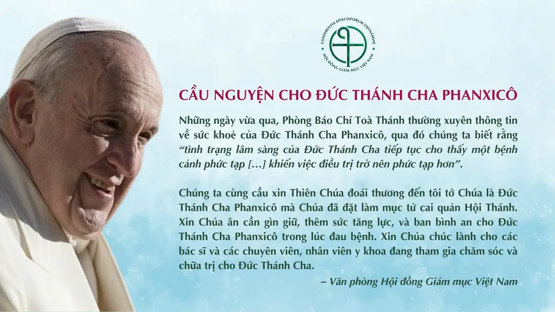 Chúng ta cùng cầu xin Thiên Chúa đoái thương đến tôi tớ Chúa là Đức Thánh Cha Phanxicô mà Chúa đã đặt làm mục tử cai quản Hội Thánh. Xin Chúa ân cần gìn giữ, thêm sức tăng lực, và ban bình an cho Đức Thánh Cha Phanxicô trong lúc đau bệnh. Xin Chúa chúc lành cho các bác sĩ và các chuyên viên, nhân viên y khoa đang tham gia chăm sóc và chữa trị cho Đức Thánh Cha.