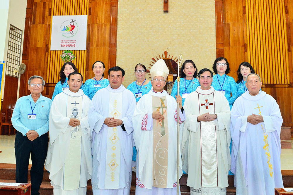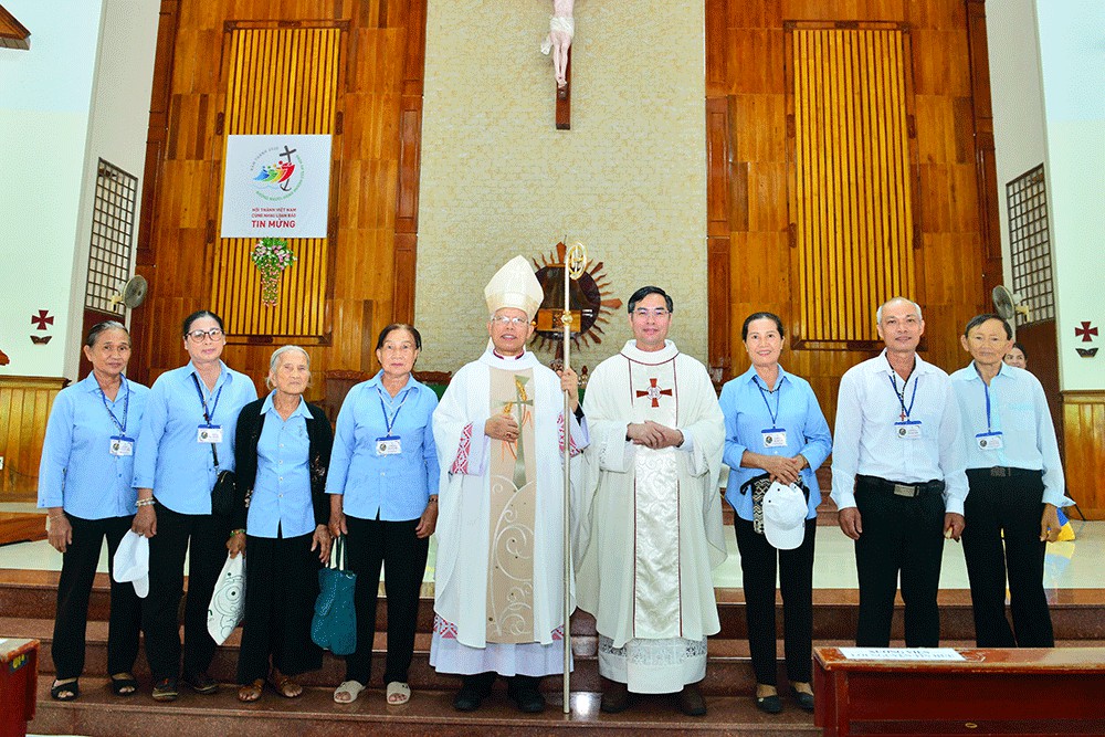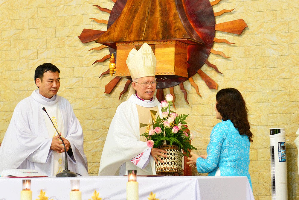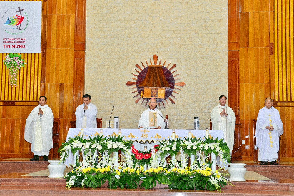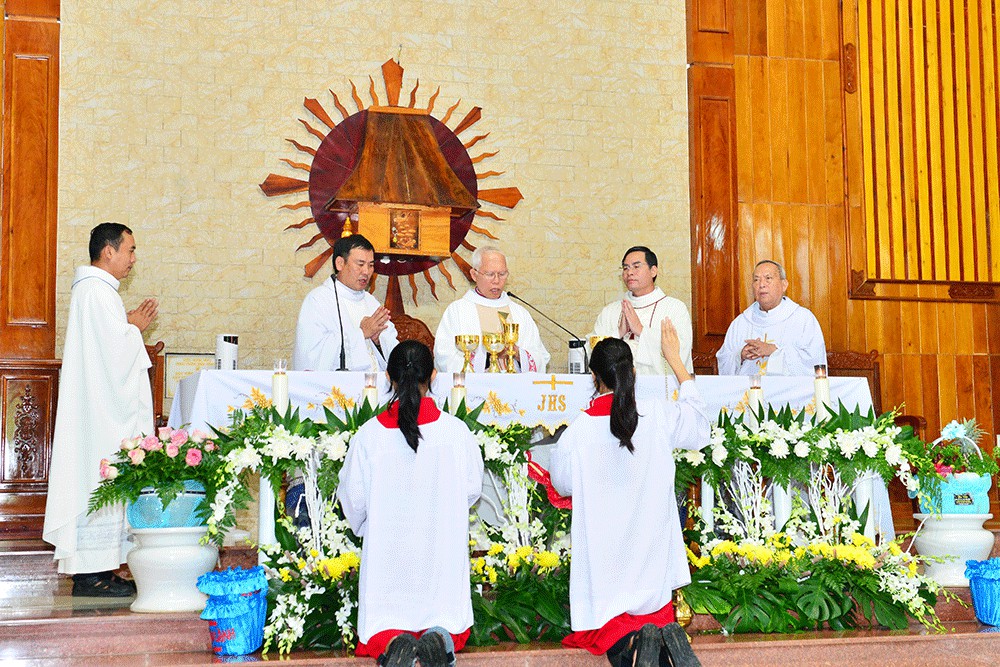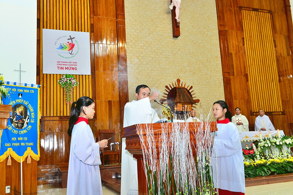 Thánh lễ do Đức cha Giuse Huỳnh Văn Sỹ - Giám mục giáo phận - chủ sự. Cùng hiện diện có Cha Phêrô Phạm Văn Bình O.P - Đặc trách Tỉnh dòng về Kinh Mân Côi và Hiệp hội Kinh Mân Côi Đa Minh Việt Nam; Cha Phêrô Mai Tính (Mi Trầm) - Đặc trách linh hướng Hội Mân Côi giáo phận Nha Trang; cùng quý Cha Quản xứ và Phó xứ Khánh Vĩnh.