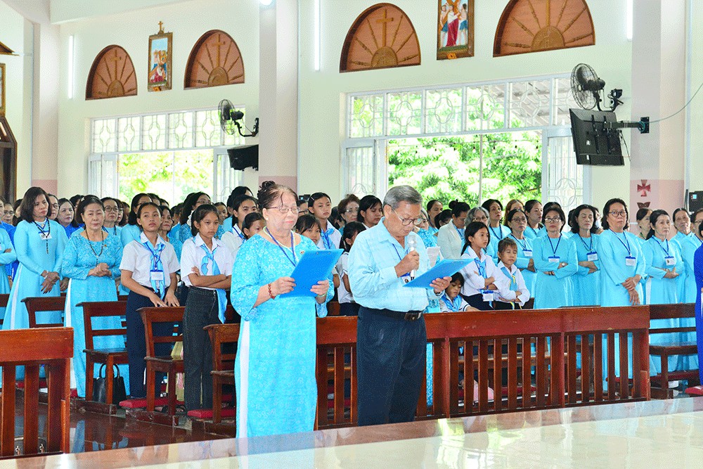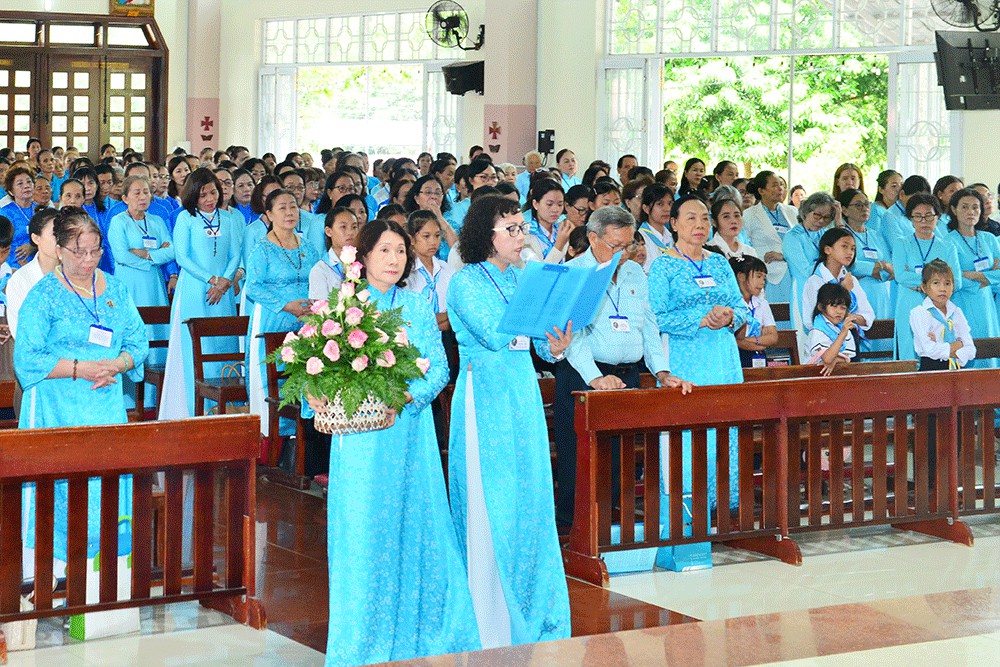 Trước Thánh lễ, cộng đoàn Hiệp hội cùng hiệp lòng tham dự giờ chầu Thánh Thể do Cha Phêrô Mai Tính chủ sự. Trong bầu khí trang nghiêm, cộng đoàn cầu xin Chúa Thánh Thần soi sáng, cùng lắng nghe Tin Mừng, suy niệm về Mẹ Maria - người luôn quan tâm và dẫn đưa con cái đến với Chúa Giêsu. Những lời hát tôn vinh Đức Mẹ và kinh nguyện dâng lên trong giờ chầu diễn tả lòng biết ơn, tín thác và ước muốn noi gương Mẹ trong cầu nguyện, yêu thương và phục vụ.