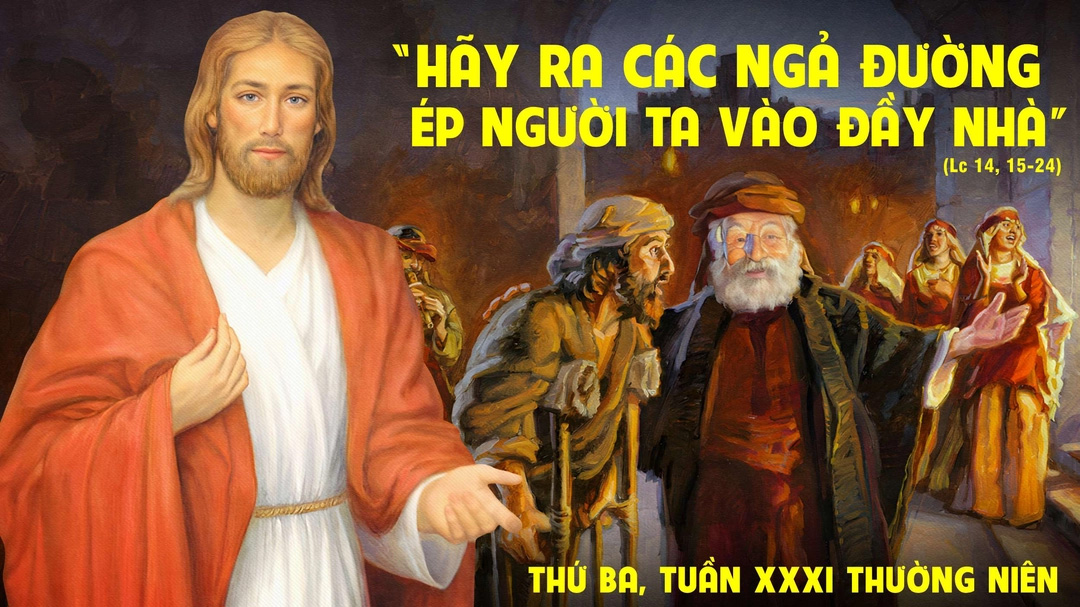 "Người đầy tớ trở về thuật lại những điều đó cho chủ mình. Bấy giờ chủ nhà liền nổi giận, bảo người đầy tớ rằng: "Anh hãy cấp tốc đi ra các công trường và các ngõ hẻm thành phố mà dẫn về đây những người hành khất, tàn tật, đui mù và què quặt". Người đầy tớ trở về trình rằng: "Thưa ông, lệnh ông ban đã được thi hành, thế mà hãy còn dư chỗ". Ông chủ lại bảo người đầy tớ rằng: "Anh hãy ra ngoài đường ngoài ngõ và cố ép người ta vào cho đầy nhà tôi. Vì tôi bảo cho các người biết: không một ai trong những kẻ đã được mời, sẽ được nếm bữa tiệc của tôi".
