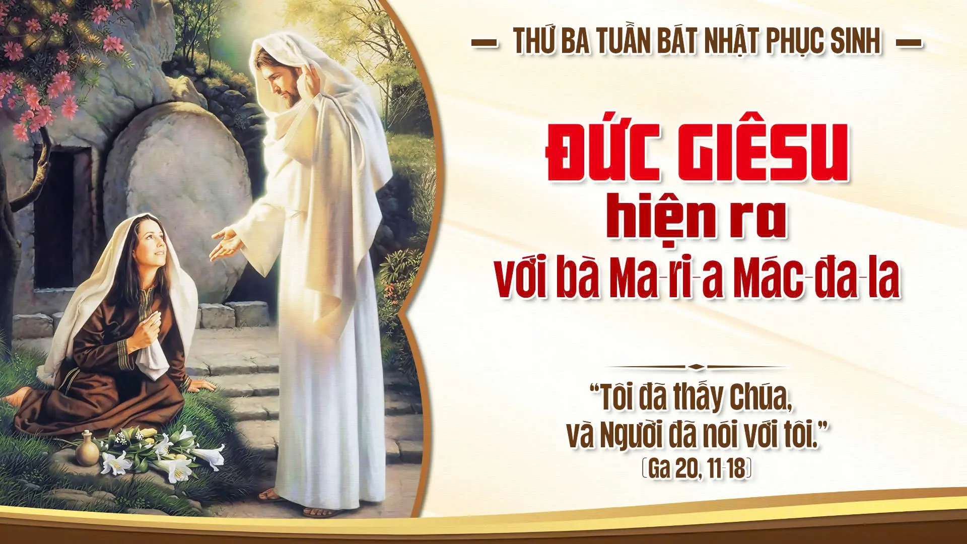 Vừa nói xong, bà quay mặt lại, thì thấy Chúa Giêsu đã đứng đó, nhưng bà chưa biết là Chúa Giêsu. Chúa Giêsu hỏi: "Bà kia, sao mà khóc, bà tìm ai?" Tưởng là người giữ vườn, Maria thưa: "Thưa ông, nếu ông đã mang xác Người đi, thì xin cho tôi biết ông đã đặt Người ở đâu, để tôi đến lấy xác Người". Chúa Giêsu gọi: "Maria". Quay mặt lại, bà thưa Người: "Rabboni!" (nghĩa là "Lạy Thầy!"). Chúa Giêsu bảo bà: "Đừng động đến Ta, vì Ta chưa về cùng Cha Ta. Nhưng hãy đi báo tin cho các anh em Ta hay và bảo họ rằng: Ta về cùng Cha Ta, cũng là Cha các con; về cùng Thiên Chúa Ta, cũng là Thiên Chúa các con".
