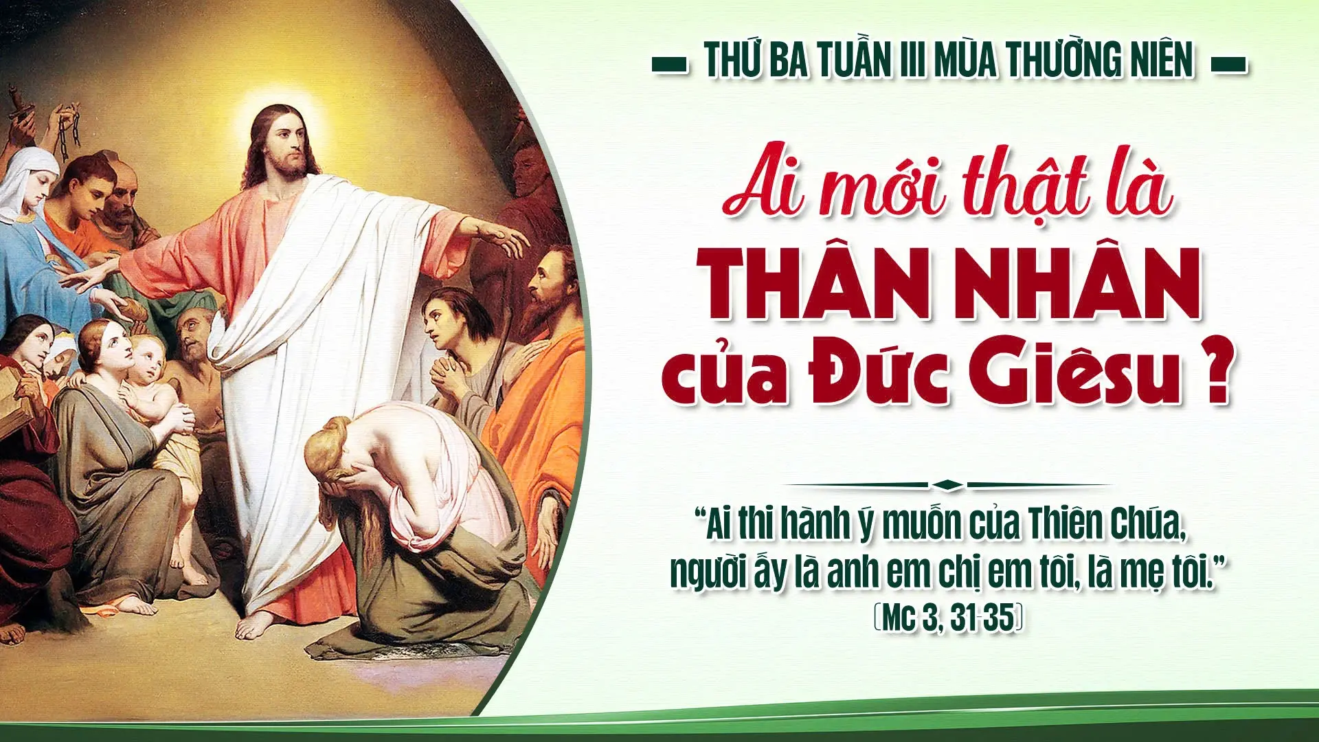 Tin mừng hôm nay mời gọi mỗi người chúng ta tự vấn lòng mình: tôi có thật sự thuộc về “gia đình của Chúa Giêsu” hay không? Tôi có lắng nghe và đem Lời Chúa ra thực hành trong đời sống thường ngày không? Khi chúng ta sống theo thánh ý Thiên Chúa, không chỉ bản thân được biến đổi, mà gia đình và cộng đoàn cũng trở nên một gia đình đích thực của Thiên Chúa, nơi tình yêu, bình an và hiệp nhất được lớn lên mỗi ngày.
