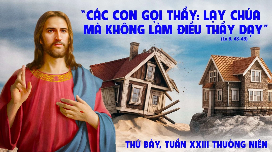 Tại sao các con gọi Thầy: 'Lạy Chúa, lạy Chúa', mà các con không thi hành điều Thầy dạy bảo? Ai đến cùng Thầy, thì nghe lời Thầy và đem ra thực hành. Thầy sẽ chỉ cho các con biết người ấy giống ai. Người ấy giống như người xây nhà: ông ta đào sâu và đặt nền móng trên đá. Khi có trận lụt, dù nước ùa vào nhà, cũng không làm cho nó lay chuyển, vì nhà đó được đặt nền trên đá. Trái lại, kẻ nghe mà không đem ra thực hành, thì giống như người xây nhà ngay trên mặt đất mà không có nền móng. Khi sóng nước ùa vào nhà, nó liền sụp đổ, và nhà đó bị hư hại nặng nề”.