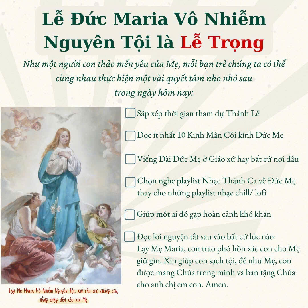 Dù không được ơn vô nhiễm như Mẹ, chúng ta có thể bước theo Mẹ bằng những lời “xin vâng” bé nhỏ mỗi ngày: sống yêu thương trong gia đình, tập tha thứ, kiên trì cầu nguyện, và biết chọn những điều đẹp lòng Chúa giữa biết bao chọn lựa của đời sống thường nhật.