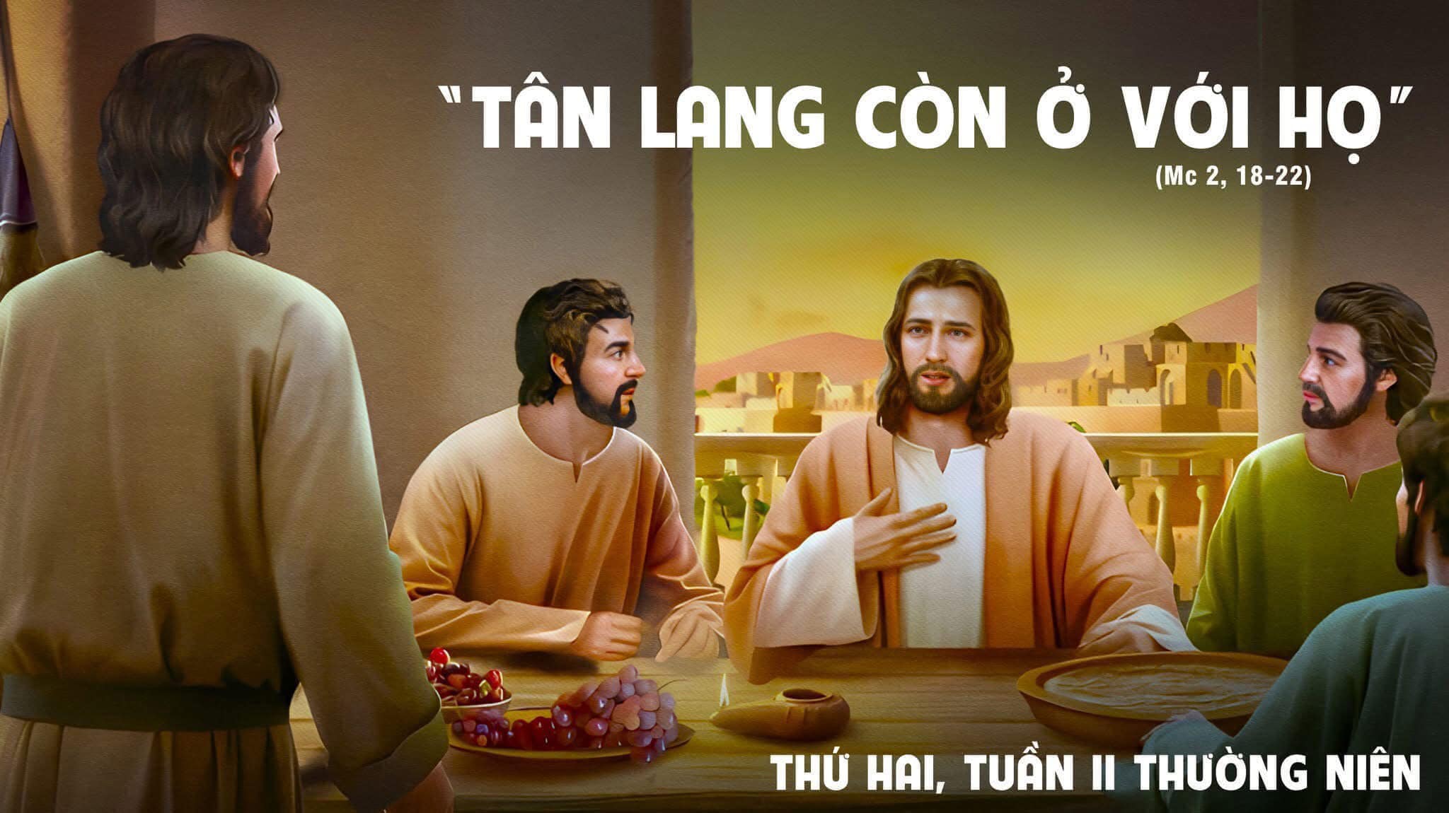 Chúa Giêsu nói với họ: "Các khách dự tiệc cưới có thể ăn chay khi tân lang còn ở với họ không? Bao lâu tân lang còn ở với họ, thì họ không thể ăn chay được. Nhưng sẽ đến ngày tân lang bị đem đi, bấy giờ họ sẽ ăn chay.
