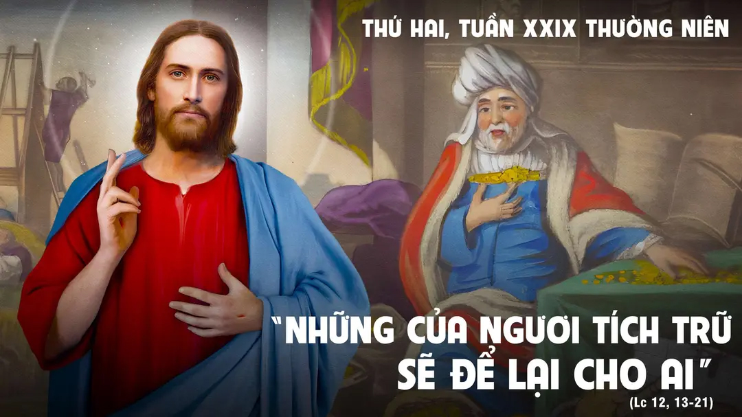 Người lại nói với họ thí dụ này rằng: "Một người phú hộ kia có ruộng đất sinh nhiều hoa lợi, nên suy tính trong lòng rằng: "Tôi sẽ làm gì đây, vì tôi còn chỗ đâu mà tích trữ hoa lợi?" Đoạn người ấy nói: "Tôi sẽ làm thế này, là phá các kho lẫm của tôi, mà xây những cái lớn hơn, rồi chất tất cả lúa thóc và của cải tôi vào đó, và tôi sẽ bảo linh hồn tôi rằng: "Hỡi linh hồn, ngươi có nhiều của cải dự trữ cho nhiều năm: ngươi hãy nghỉ ngơi, ăn uống vui chơi đi!" Nhưng Thiên Chúa bảo nó rằng: "Hỡi kẻ ngu dại, đêm nay người ta sẽ đòi linh hồn ngươi, thế thì những của ngươi tích trữ sẽ để lại cho ai?" Vì kẻ tích trữ của cải cho mình, mà không làm giàu trước mặt Chúa, thì cũng vậy".