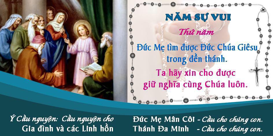 Khi tìm thấy được Chúa trong Đền Thánh, Đức Mẹ vui mừng khôn xiết. Còn về phần Chúa, Chúa vui mừng lo việc của Chúa Cha (xc. Lc 2,41-50). Xin cho người tín hữu chúng con, luôn trung thành sống theo đường lối của Chúa, với niềm hân hoan và xác tín rằng Chúa chọn chúng con làm gia nghiệp và làm con dân của Chúa, như lời Thánh Vịnh: