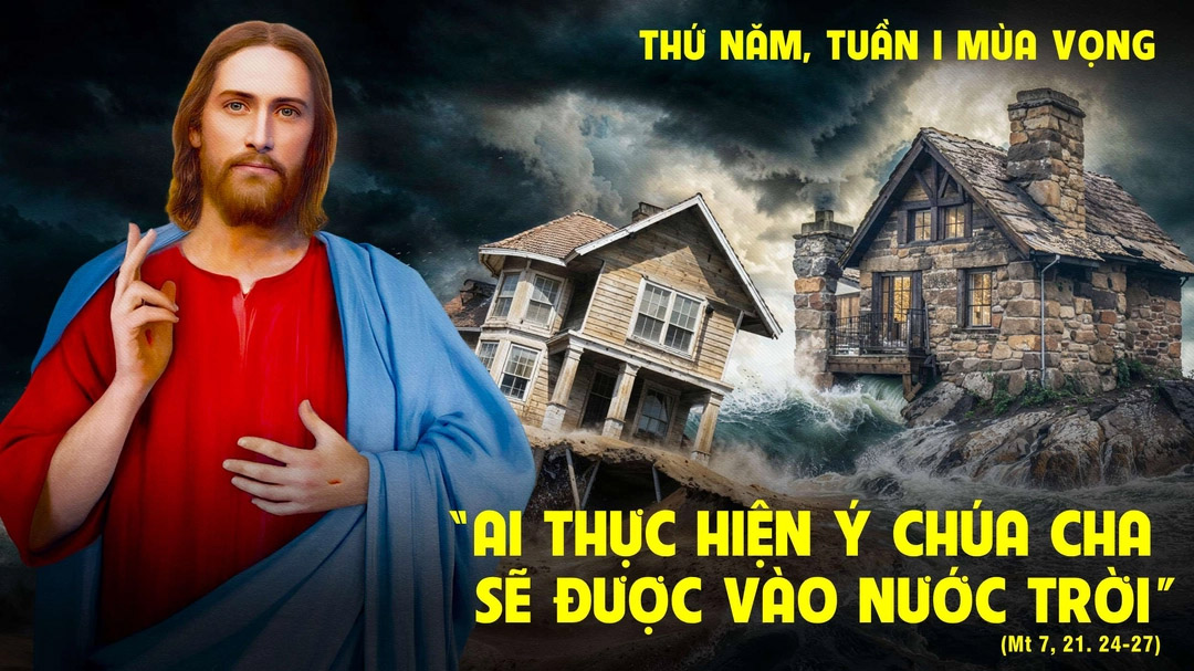 “Vậy ai nghe những lời Thầy nói đây mà đem ra thực hành, thì ví được như người khôn xây nhà trên đá. Dù mưa sa, nước cuốn, hay bão táp ập vào, nhà ấy cũng không sụp đổ, vì đã xây trên nền đá. Còn ai nghe những lời Thầy nói đây, mà chẳng đem ra thực hành, thì ví được như người ngu dại xây nhà trên cát. Gặp mưa sa, nước cuốn hay bão táp ập vào, nhà ấy sẽ sụp đổ, sụp đổ tan tành”.