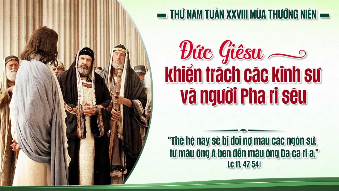 Trang Tin mừng trên được nối tiếp với trang Tin mừng hôm qua. Chúa Giêsu tiếp tục phê phán, khiển trách lối sống của những người Pharisêu và các nhà thông luật. Chúa khiển trách vì họ chỉ sống bề ngoài, nhưng thâm tâm họ lại xa rời Thiên Chúa. Như trang Tin mừng đã nói: “Khốn cho các người! Các người xây lăng cho các ngôn sứ, nhưng cha ông các người đã giết chết các vị ấy! Như vậy, các người vừa chứng thực vừa tán thành việc làm của cha ông các người, vì họ đã giết các vị ấy, còn các người thì xây lăng. Khốn cho các người, hỡi những nhà thông luật! Các người đã cất giấu chìa khoá của sự hiểu biết: các người đã không vào, mà những kẻ muốn vào, các người lại ngăn cản”.
