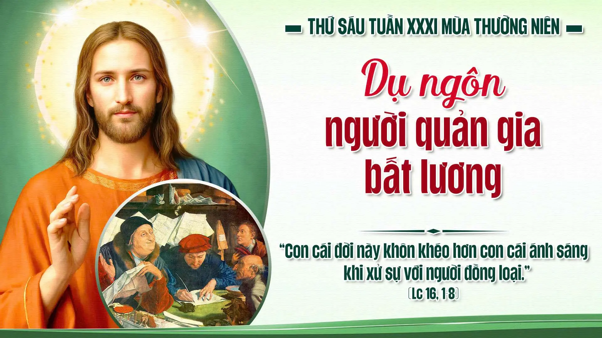 Trong Tin mừng hôm nay, Chúa Giêsu kể dụ ngôn về một người quản gia bất lương. Người được giao quản lý tài sản của chủ, nhưng vì phung phí và thiếu trung tín nên bị đòi sổ sách và sắp bị sa thải. Trước nguy cơ mất việc, ông nhanh trí tìm cách bảo đảm cho tương lai của mình: ông gọi các con nợ của chủ đến và giảm bớt số nợ cho họ, mong rằng sau này họ sẽ giúp lại ông. Dù biết việc đó không công bằng, nhưng ông chủ lại khen người quản gia đã hành động khôn ngoan.