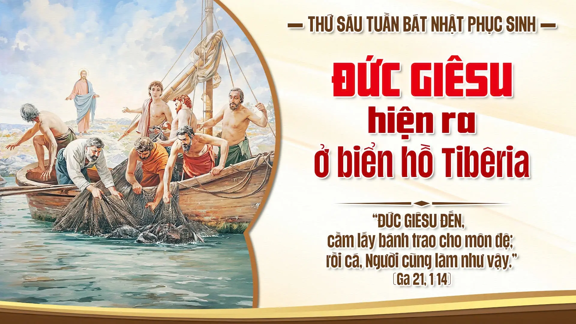 Tin mừng hôm nay thuật lại việc Chúa Giêsu hiện ra với các môn đệ bên bờ biển Tibêria, lần thứ ba sau khi Người sống lại (x. Ga 21,1-14). Sau những biến cố đau thương, các ông trở về với nghề cũ. Suốt đêm vất vả mà không bắt được gì, chiếc lưới trống rỗng phản chiếu chính tâm trạng mệt mỏi và thất vọng của các ông.