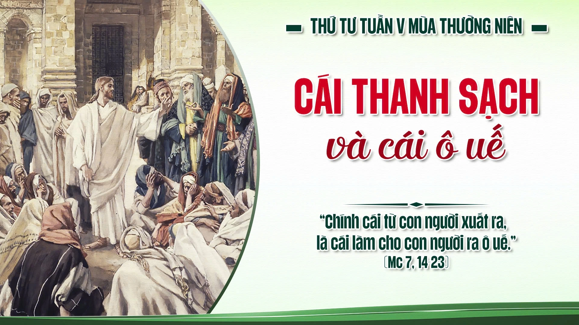 Người Do Thái thời Chúa Giêsu rất coi trọng các quy định bên ngoài như việc rửa tay, ăn uống hay sử dụng đồ dùng theo nghi thức. Những điều ấy có giá trị trong đời sống cộng đoàn, nhưng không đủ để làm cho con người nên thánh. Chúa Giêsu đưa chúng ta đi xa hơn, hướng cái nhìn vào tâm hồn, nơi phát sinh mọi hành vi. Người nói rõ: “Từ bên trong, từ lòng người, phát xuất những ý định xấu” như tà dâm, trộm cắp, giết người, ngoại tình, tham lam, độc ác, xảo trá, ganh tỵ, phỉ báng, kiêu ngạo, ngông cuồng (x. Mc 7,21-22). Chính những điều ấy làm con người xa cách Thiên Chúa và phá vỡ các mối tương quan.