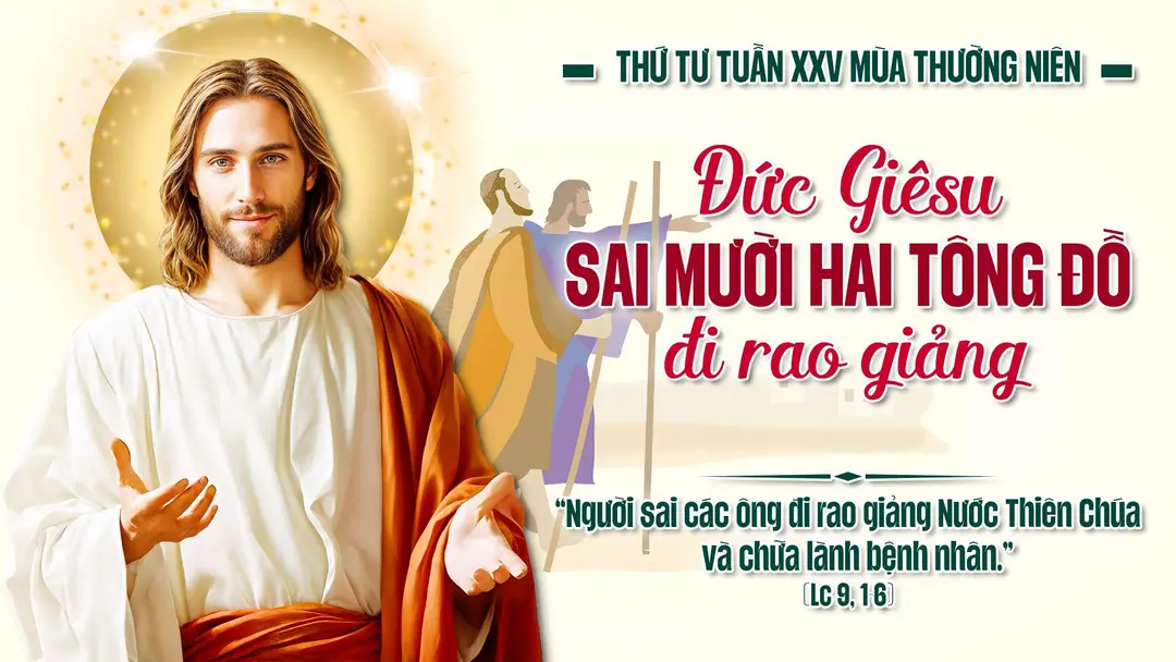 Đoạn Người sai các ông đi rao giảng nước Thiên Chúa và chữa lành bệnh nhân. Người bảo các ông rằng: "Khi đi đàng, các con đừng mang gì cả, chớ mang gậy và bị, bánh và tiền, cũng đừng mặc hai áo. Các con vào nhà nào, thì hãy ở lại đó, và đừng rời khỏi nơi ấy. Những ai không tiếp đón các con, thì khi rời bỏ thành đó, các con hãy giũ cả bụi chân lại, để làm chứng tố cáo họ".